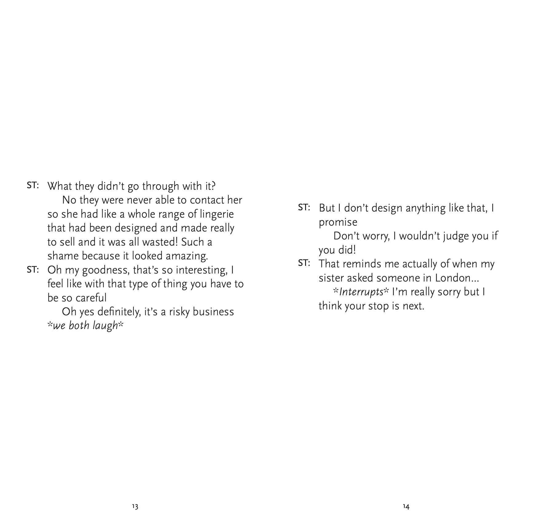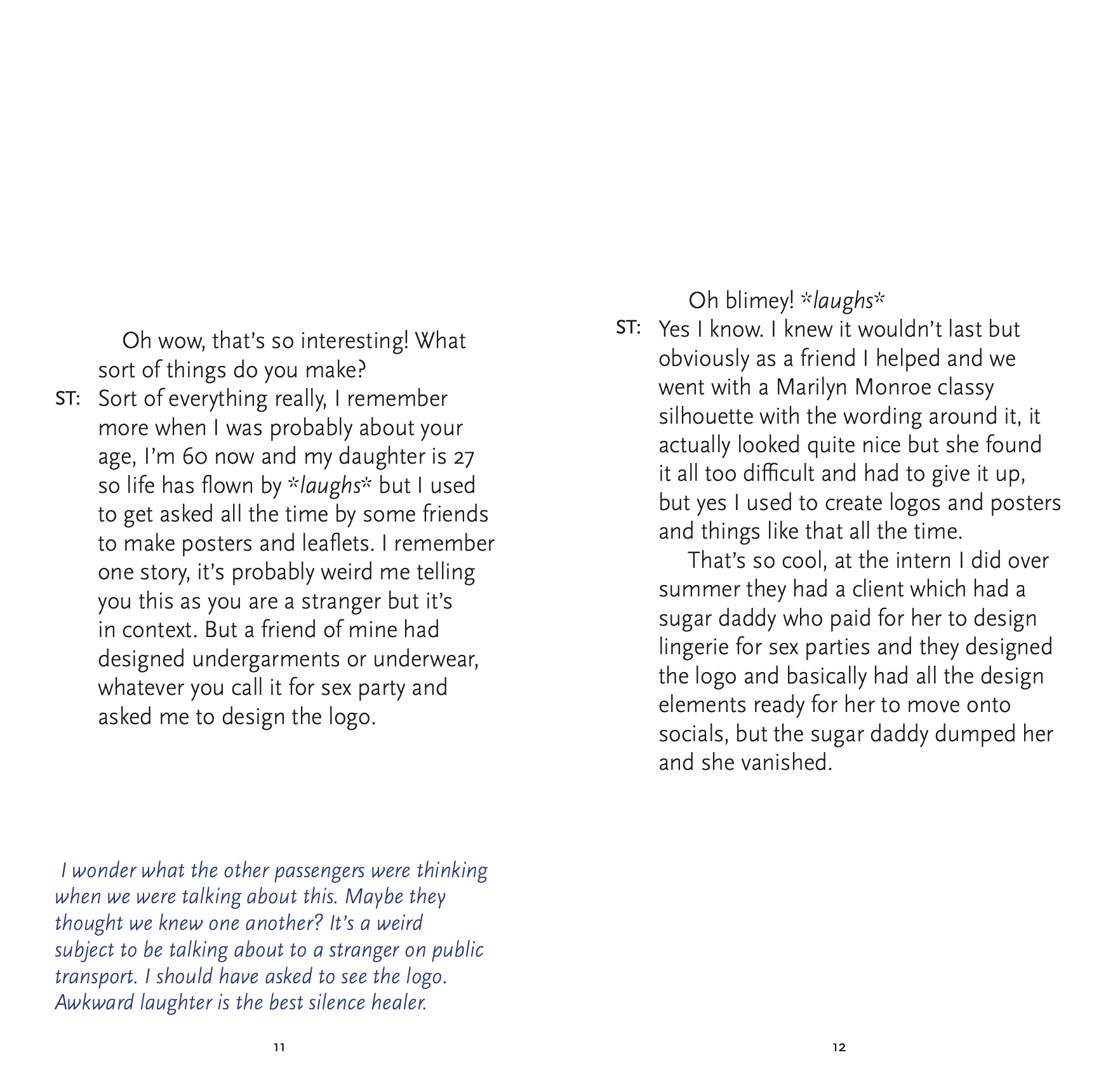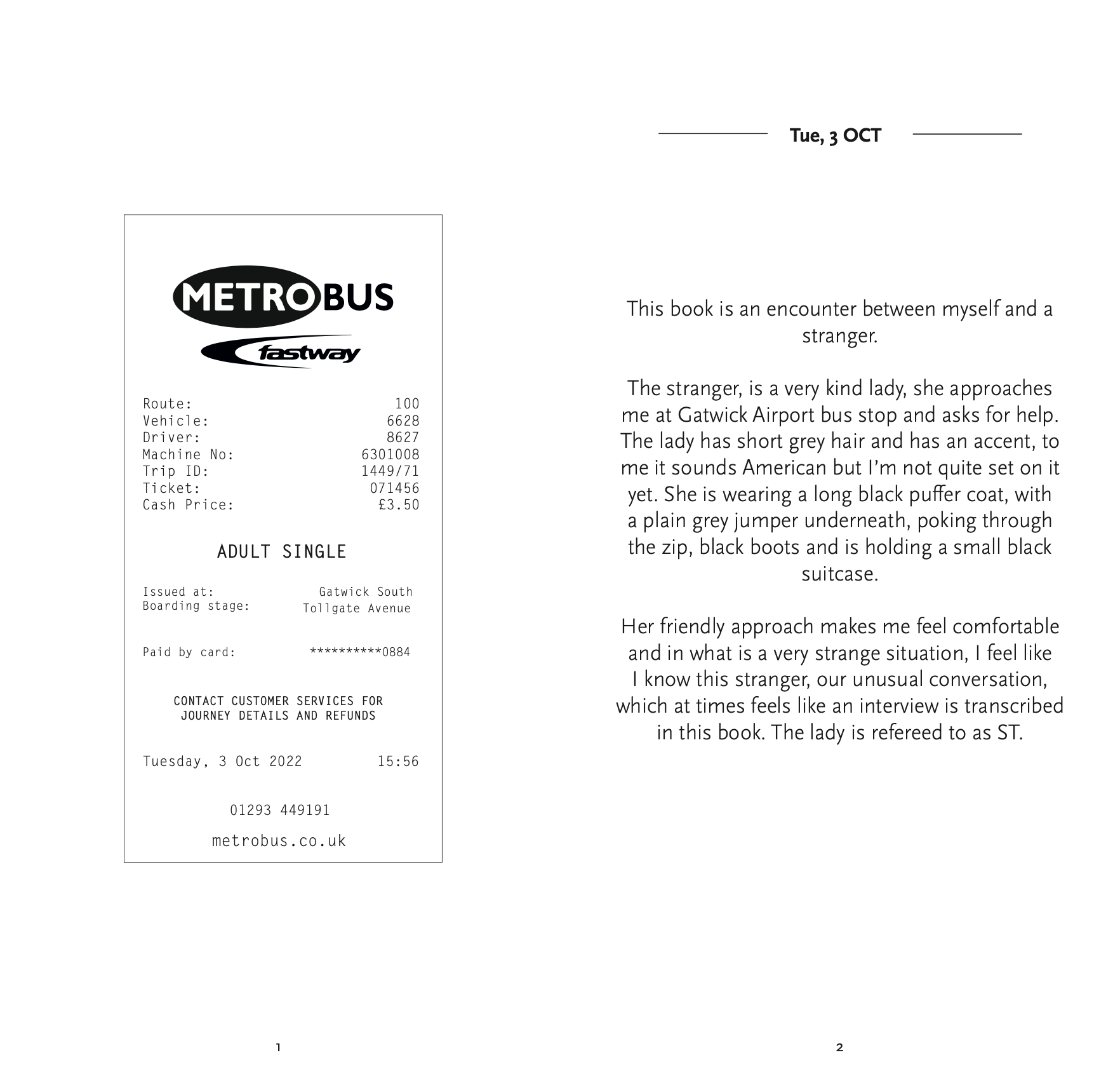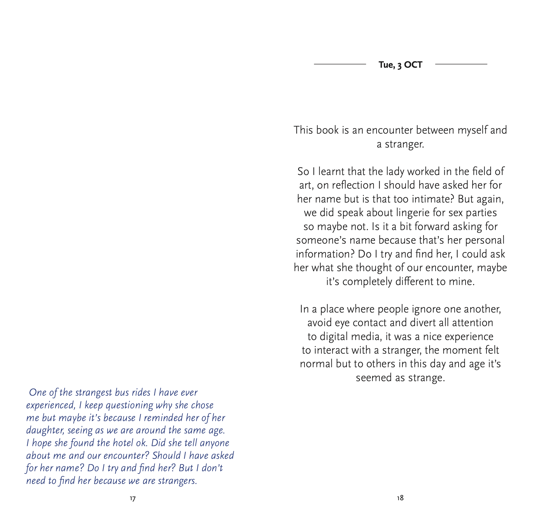 For this project, I transformed a spontaneous interview with a stranger at a bus stop into a miniature editorial book. The piece was designed to be a "natural read" for commuters, capturing the raw, authentic flow of human conversation that often goes unnoticed in our daily routines. To bring the project full circle, I printed and distributed these miniature books at bus stops, leaving them for other commuters to discover. In an era where people are increasingly tethered to their mobile devices, this tactical intervention was designed to encourage a return to basic communication and shared human experiences. By placing a physical narrative in a digital-heavy environment, I aimed to disrupt the typical commute and offer a moment of quiet, analog reflection through the power of storytelling.